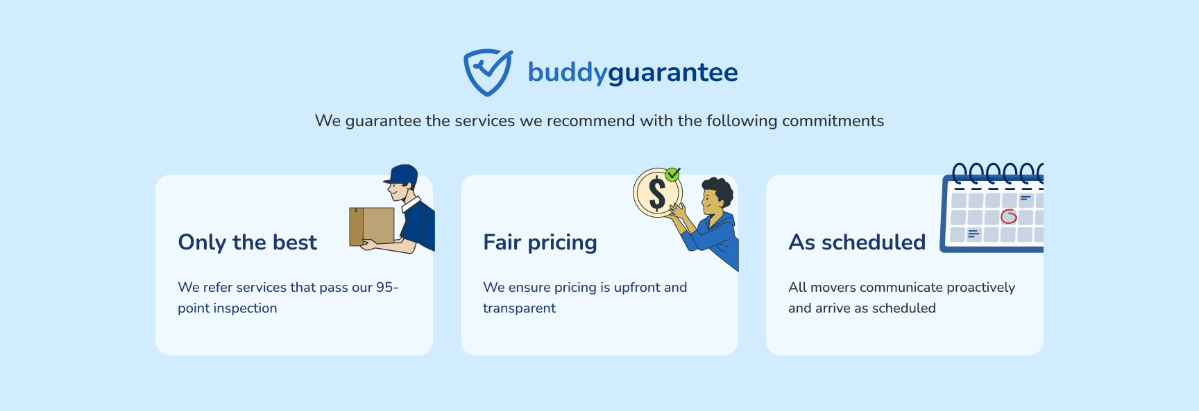 Since we were limiting choices the user saw we wanted to make sure they felt they had enough trust in the options we were presenting. Working with MoveBuddy we decided to come up with a guarantee to help safeguard users in case of issues with their movers. MoveBuddy would be vetting their movers so the risk of something happening would be reduced.